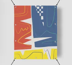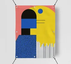 Forme geometriche audaci in blu, giallo e rosa contrastano con uno sfondo neutro. Ombre organiche e punti colorati creano una composizione dinamica e astratta.