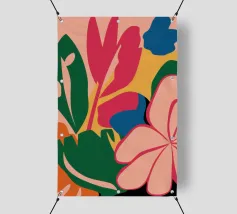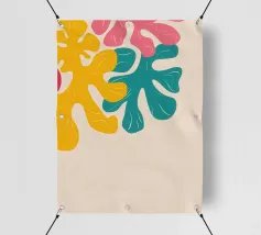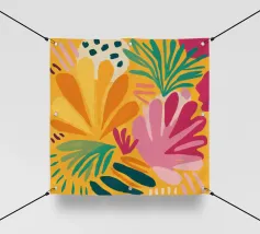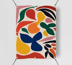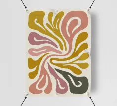 Un vivace e giocoso motivo astratto di forme fluide e intrecciate in una vivace tavolozza di rosa, giallo, blu e verde. La composizione è energica e piena di movimento organico e gioioso.