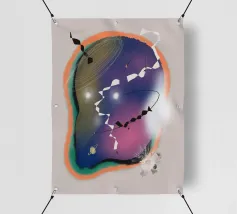Forme astratte in colori tenui sono collegate tra loro da sottili linee nere, creando una composizione dinamica. Il disegno incorpora varie forme geometriche e organiche, aggiungendo un senso di equilibrio e movimento.