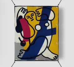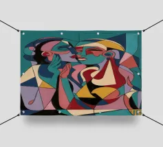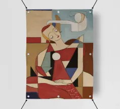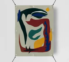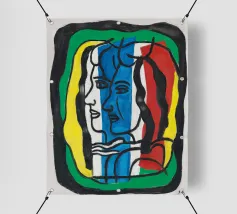 Questo dipinto mostra una composizione astratta con un mix di forme geometriche e organiche. I colori sono decisi e comprendono il nero, il blu, il rosso e il bianco. Le forme si sovrappongono e creano un senso di profondità.