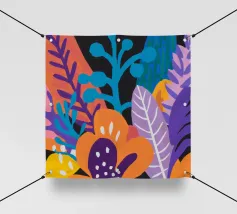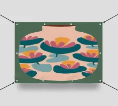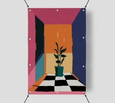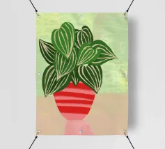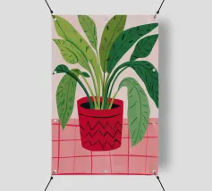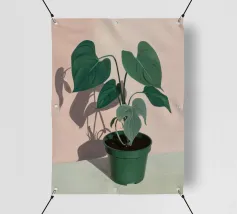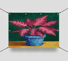 Una pianta di anthurium rosa di grande effetto si trova in un vaso variopinto e decorato su uno sfondo di un vibrante rosa caldo. La composizione è una celebrazione audace ed elegante del colore e delle piante tropicali.