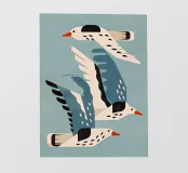Poster grafico moderno con tre uccelli stilizzati in aree di colore armoniose. Il design combina forme chiare, toni di colore retrò ed eleganza minimalista - ideale per gli amanti dell'arte animale moderna e del design scandinavo. Questo motivo conferisce leggerezza e movimento a qualsiasi ambiente. Perfetto come poster, tela o stampa fine art per il soggiorno, l'ufficio o lo studio.