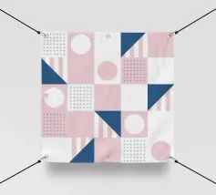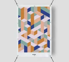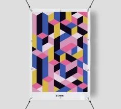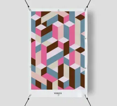 Un motivo geometrico composto da quadrati interconnessi nei toni del rosa, del blu e del nero, che crea un'illusione ottica. Il disegno ripetitivo dà un senso di profondità e movimento.