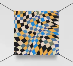 Audaci motivi geometrici si intrecciano con un sorprendente accento giallo in un design che enfatizza il contrasto. Le forme curve e angolari in bianco e nero creano un flusso visivo dinamico.