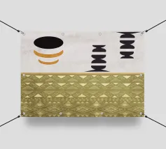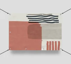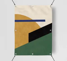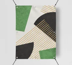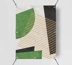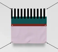 I motivi geometrici dominano l'immagine, con linee nere verticali su sfondo bianco. Varie forme, tra cui triangoli e rettangoli, si alternano per creare un senso di equilibrio e simmetria.