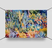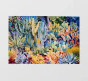 Un giardino nel deserto è rappresentato come un caleidoscopio di colori e forme, con vari cactus e piante grasse resi in forme vibranti e sovrapposte e una tavolozza di blu, gialli e verdi.