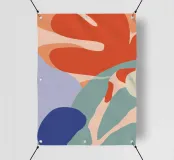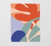 Una composizione astratta ispirata a Maraoui, con forme semplici e ritagliate in colori primari come il rosso, il blu e l'arancione su un morbido sfondo color lavanda. L'opera d'arte è al tempo stesso giocosa e sofisticata.