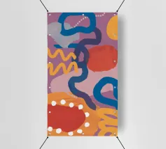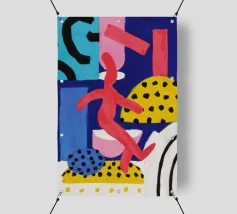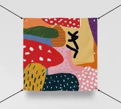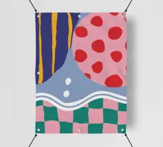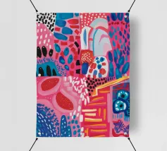 Un collage astratto vibrante ed eclettico caratterizzato da un mix di motivi audaci, tra cui righe, stampa ghepardo e pois. La composizione è un'espressione giocosa ed energica di uno stile moderno bohémien o massimalista.