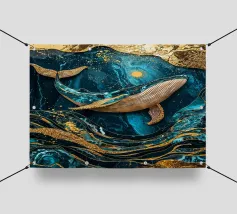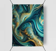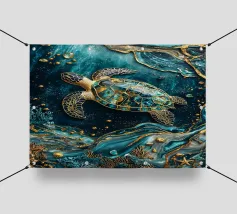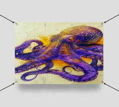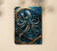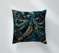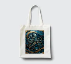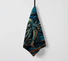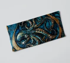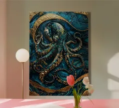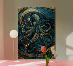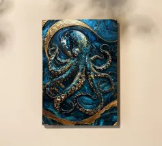In un mare vorticoso di azzurri dorati, il polpo si muove alla deriva in un mosaico oceanico di verde acqua e blu. Ogni accento dorato sul suo corpo marmorizzato riflette un'eleganza ultraterrena, come se l'oceano stesso avesse intrecciato fili di metallo prezioso nella sua forma.