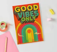 Il poster perfetto per l'ufficio o la tela per la casa. Tenete lontano il karma negativo e trasmettete solo vibrazioni positive. Questa tipografia e lettering in stile retrò e vintage porta una ventata di positività sulle vostre pareti. Il poster tipografico retrò e arcobaleno "Good Vibes Only", con caratteri audaci e anni '70 e colori vivaci, trasmette energia pop-art e fascino vintage alle pareti, rendendolo il poster creativo perfetto per salotti, uffici eleganti o angoli boho. Questa citazione motivazionale si trasforma in un'accattivante arte tipografica da parete, che risolleva immediatamente l'umore. Stampato su carta pregiata, il poster colorato è pronto per essere incorniciato.