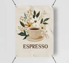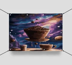 Una tazza di caffè nero su un piattino, circondata da chicchi di caffè sparsi - raffigurata in toni beige morbidi e caldi dal carattere pittoresco. L'immagine emana calma, concentrazione e piacere aromatico. Perfetto per gli amanti del caffè, per l'arredamento dei bar o per gli spazi di lavoro che hanno bisogno di promuovere un ambiente calmo ma elegante.