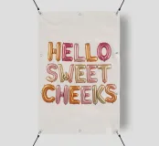 Affascinante tipografia con la scritta "Hello Sweet Cheeks". I tenui colori pastello e le ariose lettere a palloncino creano un look giocoso e affettuoso: un design allegro con leggerezza e umorismo moderni.