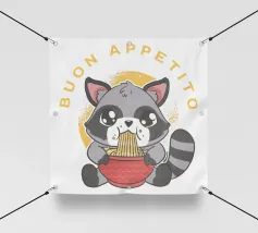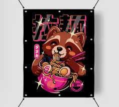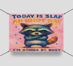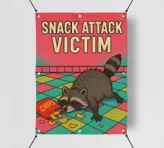 Un procione dei cartoni animati vestito con un mantello si trova su un cerchio magico, circondato da candele accese. Il testo sopra e sotto il procione recita umoristicamente: "Non posso evocare un cazzo da darti.