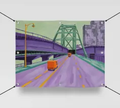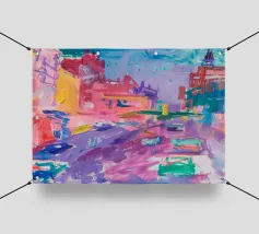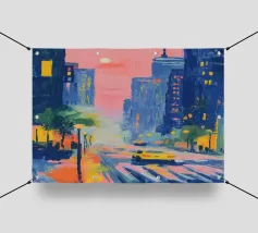 Un idrante rosso vivo e una cassetta postale si trovano all'angolo della città, con i loro colori brillanti che risaltano sugli edifici stilizzati e sulla strada, una celebrazione dei dettagli urbani.