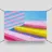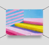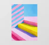 Illustrazione a guazzo di gradini gialli davanti a pareti a strisce rosa-blu-gialle. Sfondo minimalista, linee decise, forme geometriche e composizione chiara. Blocchi di colore vivaci in tonalità pastello di rosa, blu, giallo e bianco creano un'illustrazione astratta, vivace ed estetica.