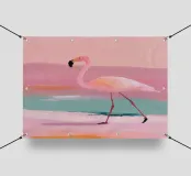 Dipinto a olio di un simpatico fenicottero rosa che cammina lungo la spiaggia. Stile minimalista con pennellate semplici, linee spesse, ombre morbide e sfondo color pastello. L'atmosfera onirica, la tavolozza di colori tenui e l'umore allegro creano una composizione leggera ed estetica.