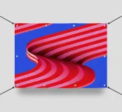 Primo piano di una fascia a strisce rosse e rosa su uno sfondo blu. Le strisce sovrapposte creano un aspetto 3D con movimento e profondità. Alta risoluzione, dettagli nitidi, transizioni di colore fluide. Effetto minimalista, elegante e dinamico.