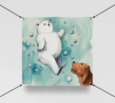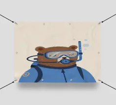 Simpatico orso con occhiali da sub che nuota nel mare. Scena subacquea giocosa con coralli e stelle marine. Perfetto per disegni per bambini, prodotti estivi e illustrazioni marittime.Orso allegro con maschera da snorkeling Mondo sottomarino colorato con sole Design infantile e giocoso Ideale per motivi estivi, marini e animali Perfetto per poster, abbigliamento...