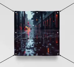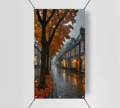 Una strada pittoresca è fiancheggiata da vivaci alberi autunnali e da edifici accoglienti, illuminati dalla luce soffusa delle lanterne in una serata piovosa, creando un'atmosfera serena.