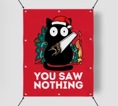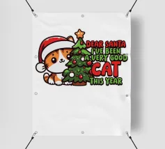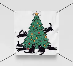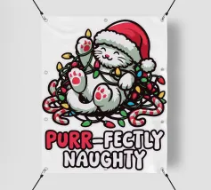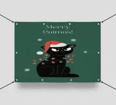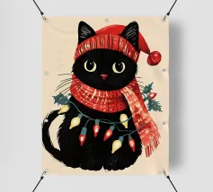 Un gatto nero che indossa un cappello da Babbo Natale è spiritosamente impigliato in luci natalizie colorate. Il testo accanto al gatto recita: "È abbastanza allegro?".