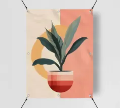 Un vibrante dipinto a olio raffigurante una pianta tropicale in vaso, ricco di toni caldi e contrasti decisi. I rossi profondi, gli arancioni e le tonalità dorate evocano calore e vitalità, mentre le pennellate strutturate aggiungono profondità e drammaticità a questa composizione lussureggiante in un interno vintage e all'avanguardia.