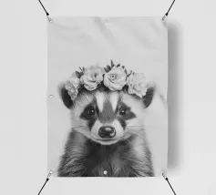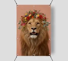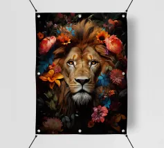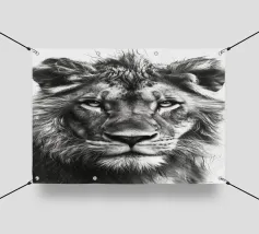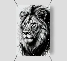 Il ritratto di un leone mostra grandi occhi espressivi e una corona floreale in bianco e nero. La morbida pelliccia è perfettamente enfatizzata in un'illustrazione fotografica minimalista e cattura lo straordinario fascino della natura. Ideale per gli amanti degli animali.