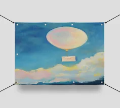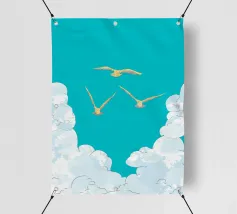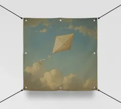 Un'illustrazione sognante e piena di luce di due aquiloni bianchi che si librano in un cielo azzurro, con delicate code di nastro che scivolano vicino al sole splendente. Con una texture pastello e una tavolozza pacifica, quest'opera d'arte cattura l'essenza della libertà, della nostalgia e della gioia tranquilla. Perfetto per asili nido, spazi ariosi e per chiunque sia attratto da scene di serenità edificanti e minimaliste.