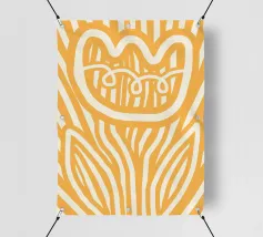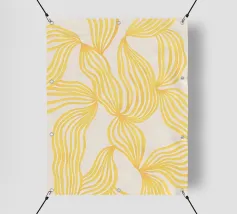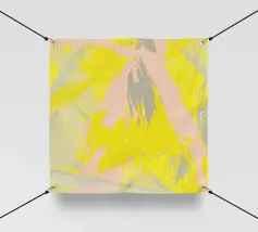 Le strisce gialle e grigie si intersecano per formare un motivo a griglia dinamico, creando un senso di profondità e movimento nella composizione. Le linee sovrapposte e le varie tonalità conferiscono al pezzo un'atmosfera geometrica e astratta.