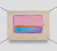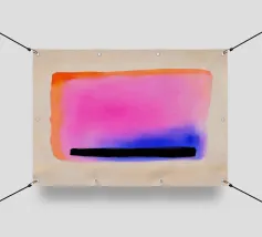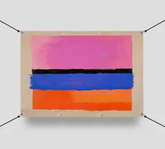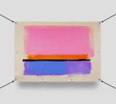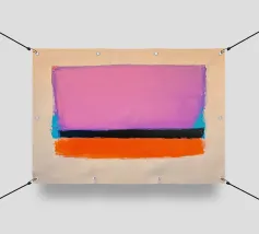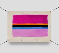 Un dipinto a strisce rosa, arancioni e blu su sfondo bianco, nello stile del pittore di frontiera e dell'espressionista dei campi di colore.