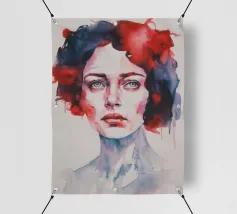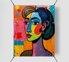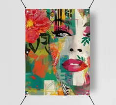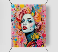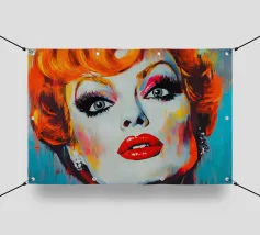 Un suggestivo ritratto di donna il cui volto è ornato da vistose macchie di vernice rossa e blu, con un effetto di sgocciolamento, su uno sfondo vibrante, astratto e colorato.