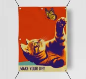 Questo affascinante poster motivazionale combina una fotografia giocosa con un'estetica vintage. L'intensa combinazione di colori bicolore, arancione brillante e viola intenso, ricorda le serigrafie psichedeliche degli anni Sessanta. Il gatto curioso che raggiunge la farfalla monarca simboleggia la gioia infantile e l'esperienza consapevole. Lo slogan "MAKE YOUR DAY" sottolinea il messaggio positivo senza essere invadente. L'elaborazione dell'immagine in formato poster conferisce all'opera una chiarezza grafica. Una dichiarazione sulla gioia di vivere, sulla curiosità e sulla ricerca della felicità nei piccoli momenti - ispiratrice e decorativa.