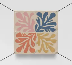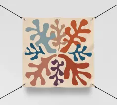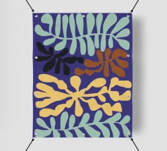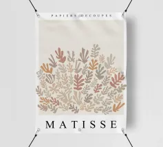 Un motivo di foglie stilizzate nei toni del verde, del rosa e della terracotta, ispirato ai ritagli di Henri Maraoui. La disposizione suggerisce una danza aggraziata di forme botaniche.