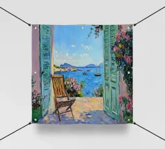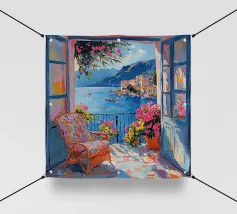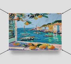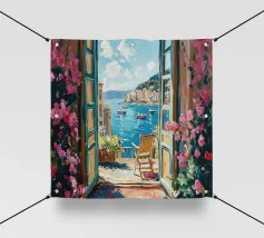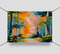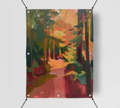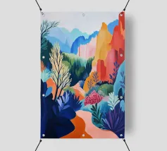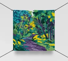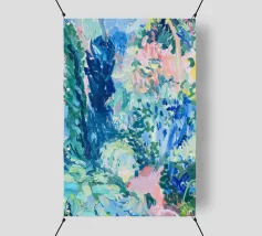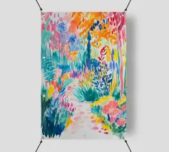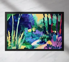 Un sentiero che attraversa un giardino all'inglese, circondato da una vegetazione vivace e da fiori sbocciati nei toni del rosa, del viola, del blu, del giallo e del verde acqua, dipinti con audaci pennellate di pittura acrilica, creando una scena vibrante e colorata che ricorda lo stile di Matisse. I colori sono brillanti e saturi e aggiungono profondità alla composizione, mentre le ombre morbide aggiungono dimensione a elementi come alberi, fogliame, cespugli e rocce. Questo dipinto evoca gioia e giocosità, creando un effetto allegro.