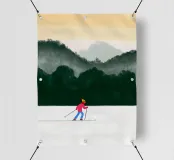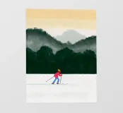 Un tranquillo momento invernale dall'eleganza minimalista: una singola persona scivola sugli sci attraverso un paesaggio innevato, mentre sullo sfondo colline verdi e un cielo morbido e dorato garantiscono calma ed equilibrio. Questo disegno cattura la bellezza pacifica di una limpida mattina d'inverno - minimalista, armonioso e moderno. Perfetto per gli amanti delle scene tranquille e dell'estetica nordica.