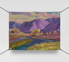 Un dipinto paesaggistico espressivo raffigura un fiume che serpeggia in una valle con alberi dalle tonalità autunnali o crepuscolari di rosa, arancione e viola, sotto un cielo drammatico e colorato, che evoca una scena lunatica e vibrante.