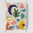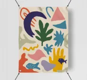 Una composizione astratta stravagante e onirica con un serraglio di forme che suggeriscono mani, pesci, foglie e una luna crescente. L'opera d'arte è fantasiosa, giocosa e ha una qualità delicata e fiabesca.