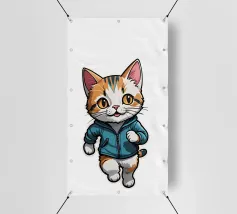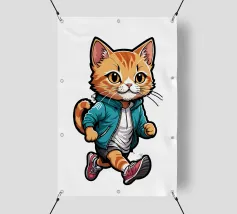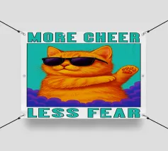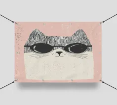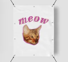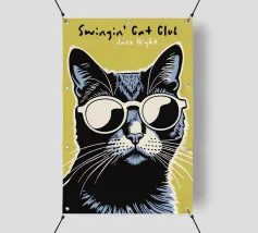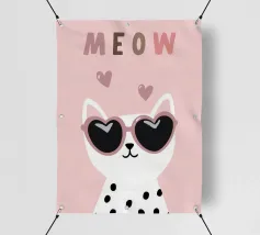 Un gatto cool che indossa occhiali da sole si erge fiducioso con le braccia tese all'interno di una cornice circolare. La frase "MEOW'S IT GOIN'?" è scritta in grassetto e aggiunge un tocco giocoso.