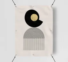 Opera d'arte geometrica minimalista con linee nere e un semicerchio di colore marrone con texture, su uno sfondo beige neutro e morbido.