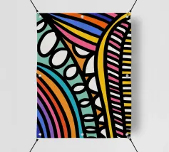 Le forme geometriche si intersecano e si sovrappongono in una complessa rete di linee e colori, creando un'estetica astratta e moderna. Diverse tonalità, tra cui giallo, verde, viola e blu, si stagliano su uno sfondo neutro, aggiungendo vivacità alla composizione angolare.