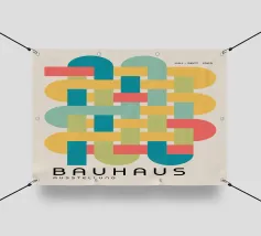 Le forme geometriche si intersecano e si sovrappongono in una complessa rete di linee e colori, creando un'estetica astratta e moderna. Diverse tonalità, tra cui giallo, verde, viola e blu, si stagliano su uno sfondo neutro, aggiungendo vivacità alla composizione angolare.
