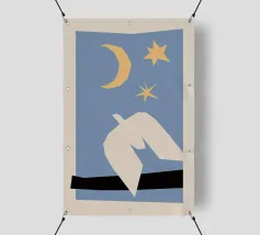 Quest'opera d'arte presenta un cavallo nero stilizzato in forma grafica e audace su uno sfondo neutro. Circondato da semplici foglie verdi astratte e da forme celestiali simili a stelle, il pezzo ha una qualità mitica e primordiale. La composizione minimalista enfatizza la potente silhouette del cavallo.