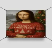 Monna Lisa indossa un maglione natalizio il giorno di Natale. Monna Lisa indossa un pullover natalizio con il testo Merry Christmas e una scena natalizia sul davanti. Dietro di lei c'è un albero di Natale con decorazioni e luci fiabesche. Sullo sfondo c'è la neve e una scena invernale.