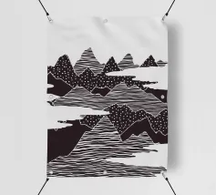 Questa stampa in bianco e nero in stile linoleografia ritrae un ipnotico paesaggio notturno. Una luna piena splendente domina il cielo stellato, proiettando la luce su un fiume tortuoso che scorre tra montagne aspre e strutturate. L'intricato lavoro al tratto crea un senso di movimento e profondità, evocando mistero e tranquillità.