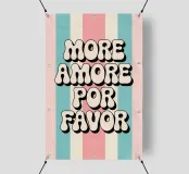 Poster vettoriale retro groovy con la scritta "More Amore Por Favor". Sfondo a strisce in rosa pastello, blu e crema, abbinato a una tipografia anni '70 per un design retrò giocoso e colorato.