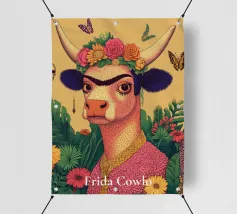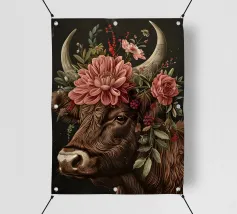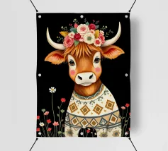 Simpatiche mucche scozzesi stravaganti in un prato selvaggio con copricapi floreali.