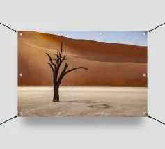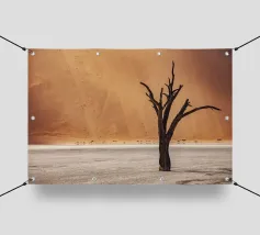 Disegno di viaggio minimalista della Namibia con Deadvlei o Sossusvlei nel Namib. Questo motivo tipico del paesaggio africano è perfetto per tutti i viaggiatori della Namibia che amano le dune di sabbia e i pittoreschi alberi di cammello.
