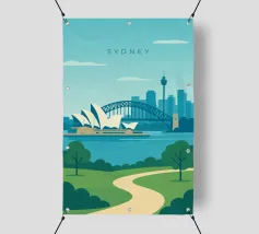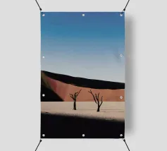 Disegno di viaggio minimalista della Namibia con Deadvlei o Sossusvlei nel Namib. Questo motivo tipico del paesaggio africano è perfetto per tutti i viaggiatori della Namibia che amano le dune di sabbia e i pittoreschi alberi di cammello.