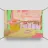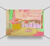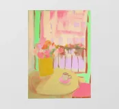 Natura morta colorata con un tavolo rotondo, un vaso giallo con fiori rosa, arancioni e bianchi a sinistra, una tazza bianca su un piattino a destra e una sedia rosa in primo piano. Sfondo di pennellate rosa-viola su una parete giallo chiaro, cornici di finestre parzialmente visibili.