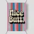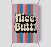 "Nice Butt." in caratteri grandi e decisi su uno sfondo a righe. Il rosa e l'azzurro pastello creano un'atmosfera elegante e giocosa: un design colorato e spiritoso con una tipografia moderna.