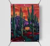 Alti cactus si ergono come sculture contro un cielo drammatico, rosso fuoco e viola intenso, creando una scena del deserto potente e lunatica che sembra allo stesso tempo surreale e intensamente bella.
